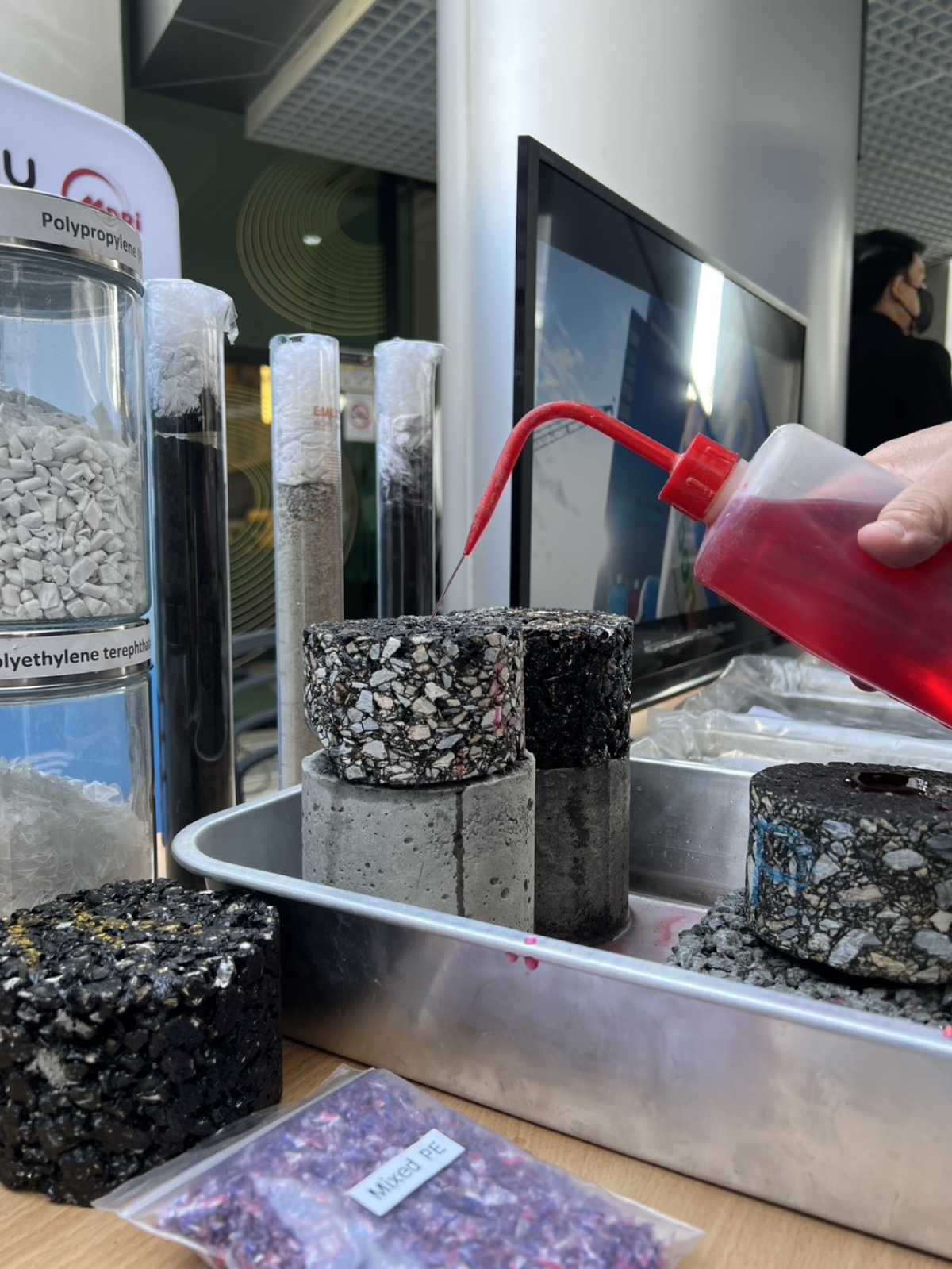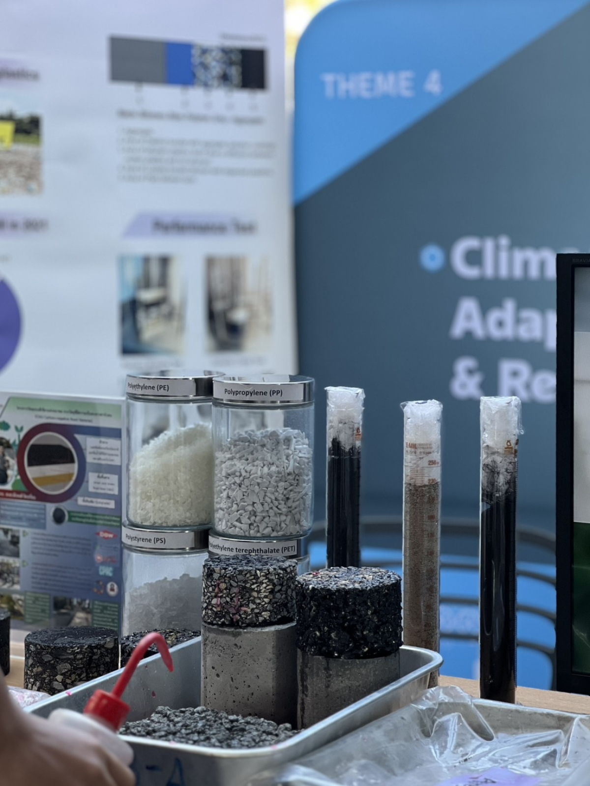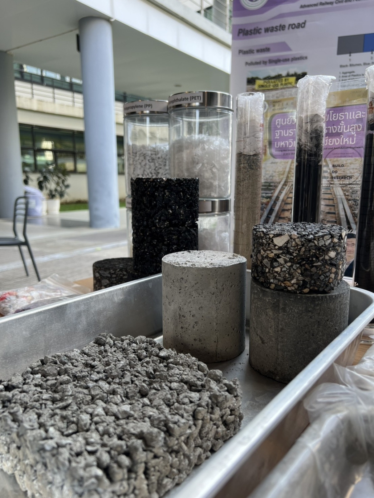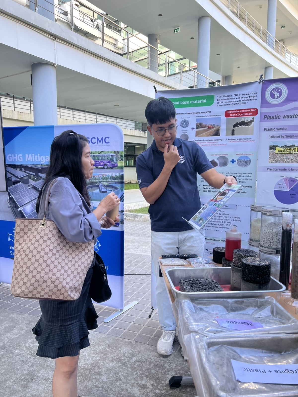 อีกหนึ่งไฮไลต์ที่ผู้เข้าร่วมงานให้ความสนใจอย่างล้นหลาม คือการจัดแสดงผลงานวิจัยชิ้นโบว์แดงที่บูธนิทรรศการ กับโครงการ "วัสดุถนนสีเขียวแห่งอนาคต (CMU Carbon-negative Road Material)" นวัตกรรมสุดเจ๋งที่เปลี่ยน "ขยะพลาสติกครัวเรือน" และ "ไบโอชาร์" (ถ่านชีวภาพจากซากข้าวโพดและเศษไม้) ให้อัปไซเคิลกลายเป็นชั้นพื้นและผิวถนนที่แข็งแกร่ง ซึมน้ำได้ ซึ่งเป็นโซลูชั่นสำคัญที่ตอบโจทย์ภาคอุตสาหกรรมก่อสร้างในการลดการปล่อยก๊าซเรือนกระจกได้อย่างเป็นรูปธรรม!