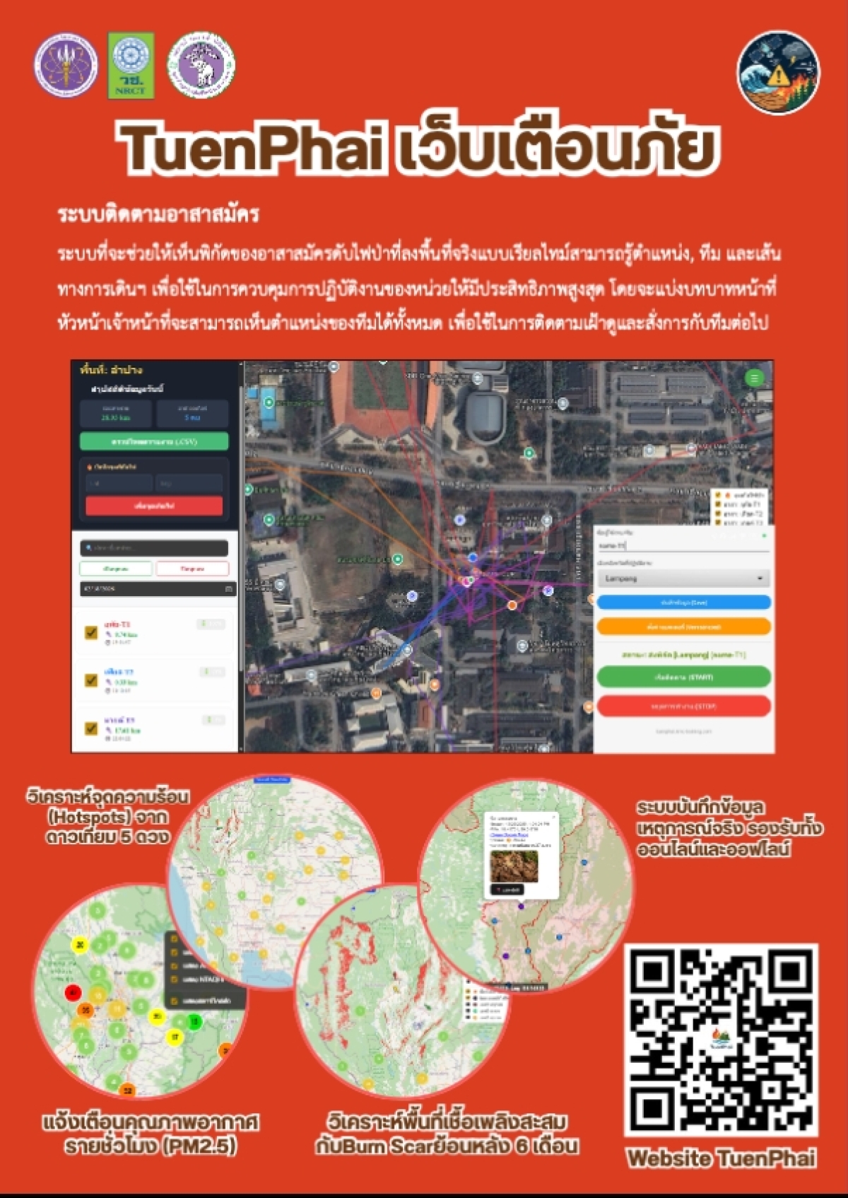 🔹Web Application (Tuen Phai) ทำหน้าที่เป็นศูนย์กลางข้อมูลอัจฉริยะ สำหรับติดตามสถานการณ์ค่าฝุ่น PM2.5 และจุดความร้อน (Hotspot) แบบ Near Real-Time โดยเชื่อมโยงข้อมูลจากหลายแหล่ง ทั้งภายในประเทศและต่างประเทศ รวมถึงข้อมูลดาวเทียมจากหน่วยงานสากล