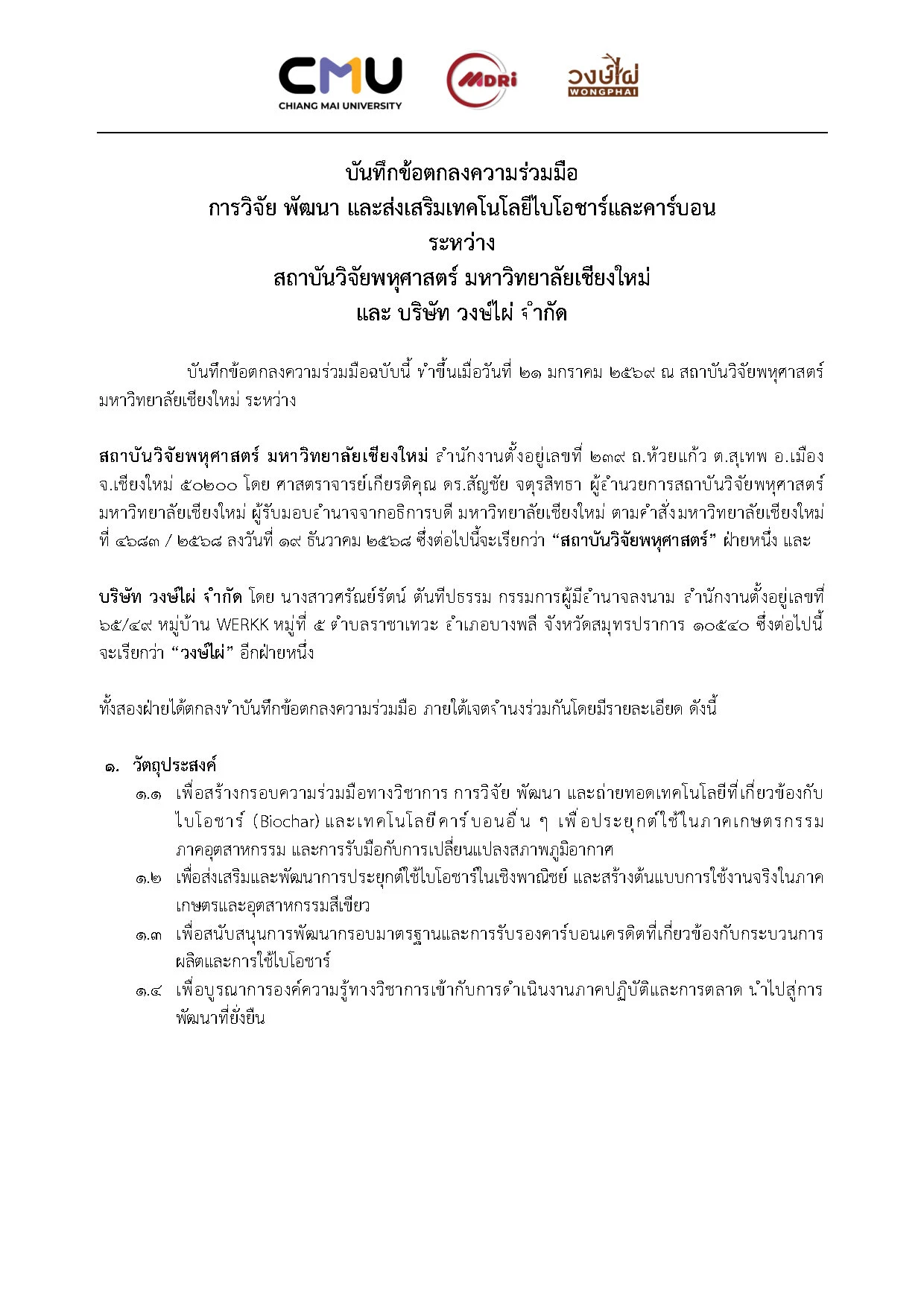 บันทึกข้อตกลงความร่วมมือ การวิจัย พัฒนา และส่งเสริมเทคโนโลยีไบโอชาร์และคาร์บอน ระหว่าง มหาวิทยาลัยเชียงใหม่ และ บริษัท วงษ์ไผ่ จำกัด |