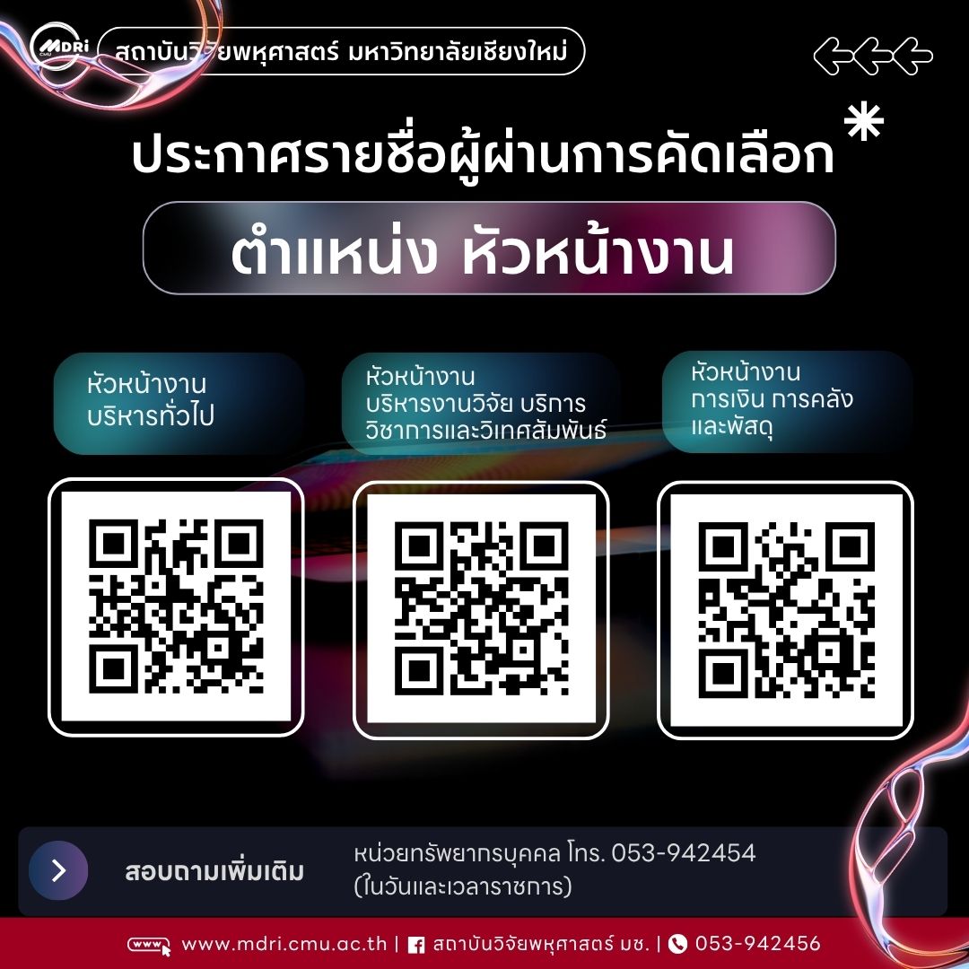 เรื่อง ผลการคัดเลือกบุคคลเพื่อแต่งตั้งให้ดำรงตำแหน่งหัวหน้างาน สังกัดสำนักงานสถาบันวิจัยพหุศาสตร์ จำนวน 3 งาน ดังแนบ