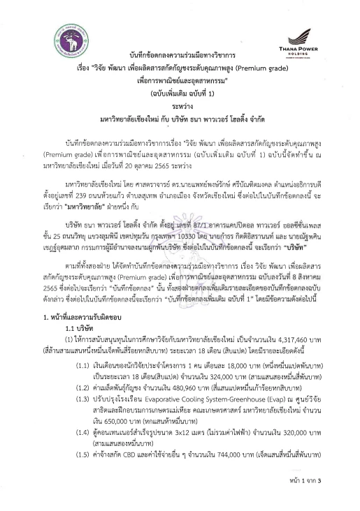 บันทึกข้อตกลงความร่วมมือทางวิชาการ เรื่อง วิจัย พัฒนา เพื่อผลิตสารสกัดกัญชงระดับคุณภาพสูง (Premium grade) เพื่อการพาณิชย์และอุตสาหกรรม (ฉบับเพิ่มเติม) |