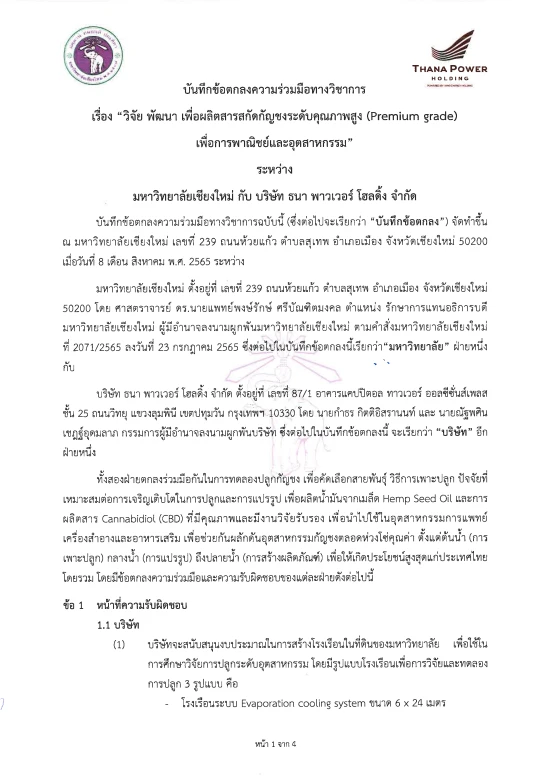 บันทึกข้อตกลงความร่วมมือทางวิชาการ เรื่อง วิจัย พัฒนา เพื่อผลิตสารสกัดกัญชงระดับคุณภาพสูง (Premium grade) เพื่อการพาณิชย์และอุตสาหกรรม |