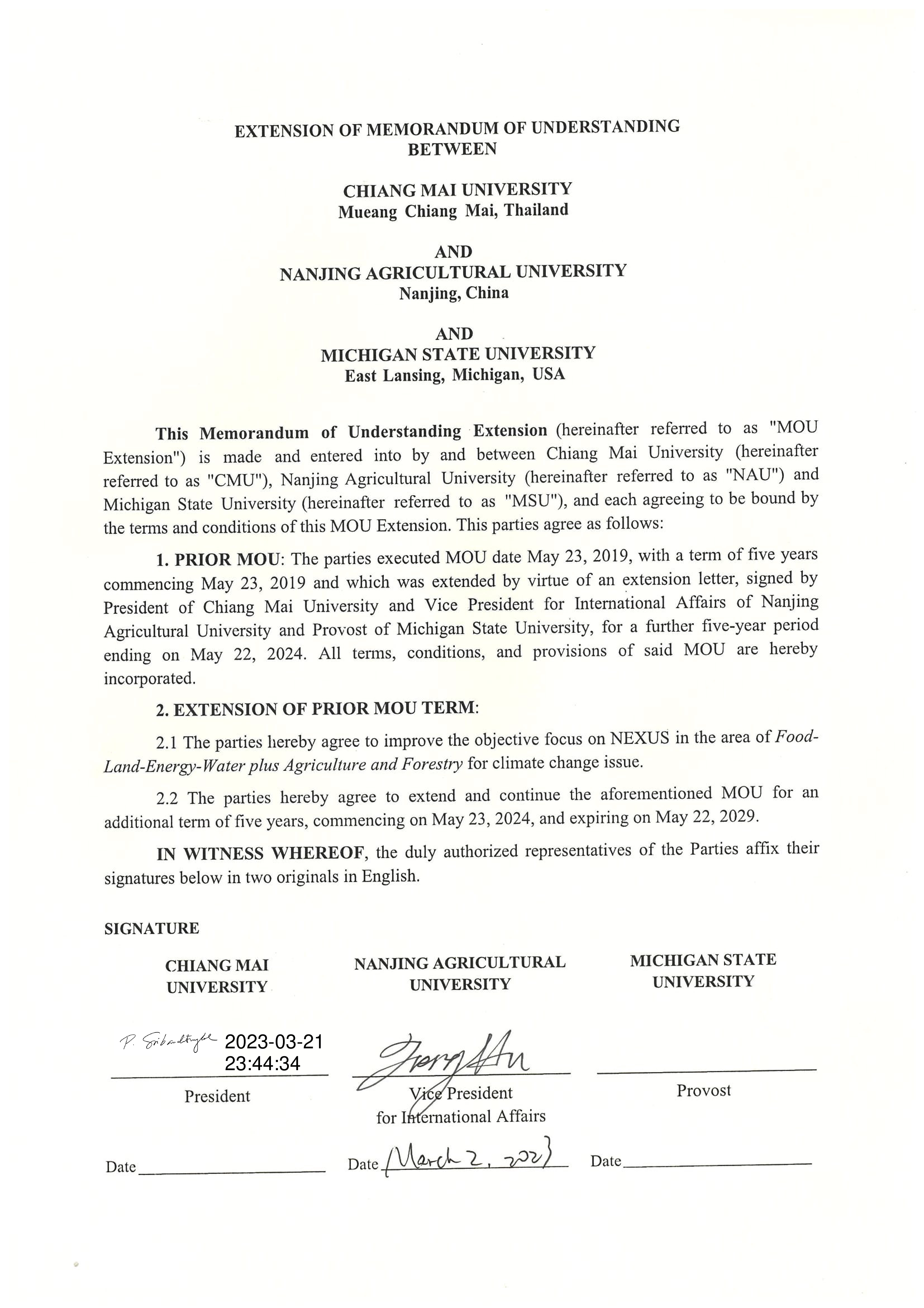 Extension of Memorandum of Understanding between Chiang Mai University & Nanjing Agricultural University, China, & Michigan State University, USA |