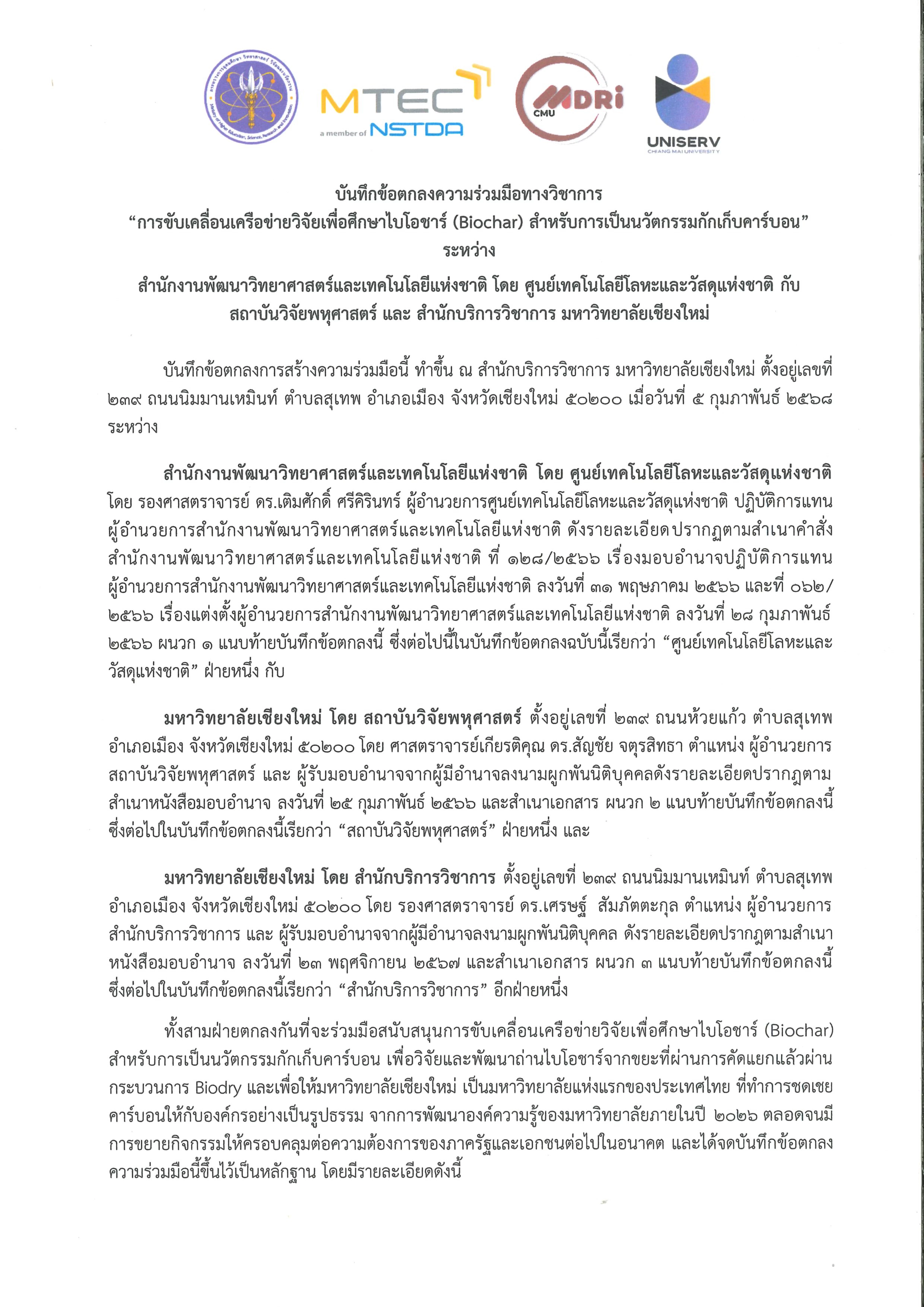 บันทึกข้อตกลงความร่วมมือทางวิชาการ การขับเคลื่อนเครือข่ายวิจัยเพื่อศึกษาไบโอชาร์ (Biochar) สำหรับการเป็นนวัตกรรมการกักเก็บคาร์บอน |
